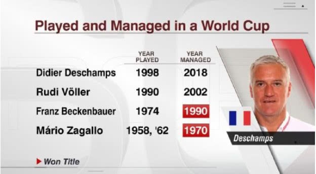 这次晋级到世界杯决赛,是法国队时隔12年再次进入到世界杯决赛,以此同时这也是法国近6届世界杯以来3次闯入世界杯决赛;这其中有一次是捧起了大力神杯,那就是在1998年法国世界杯,法国队在本土世界杯中获得冠军。若法国在决赛中击败克罗地亚,那么法国主帅德尚将成为扎加洛和贝肯鲍尔之后第三位以球员和教练身份获得世界杯冠军的人。因此,法国队都期待着时隔20年后再度夺取大力神杯。