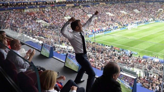 看图说话,当曼朱基奇的乌龙球帮助法国取得1-0领先之后,与普京、因凡蒂诺、克罗地亚总统基塔罗维奇一同在现场观战的法国总统马克龙兴奋地从自己的座位上站了起来,并激情地挥拳庆祝。