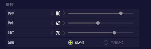 战术选项的速度,决定球员向前跑位的速度及倾向,主要体现的效果为队友控制皮球或刚反抢完后,球员向前前插的速度。