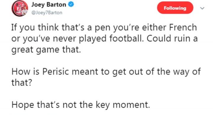 曼城名宿乔伊-巴顿便在推特中写道:“如果你觉得那是一粒点球,你要么是个法国人,要么就从来没踢过球。”
