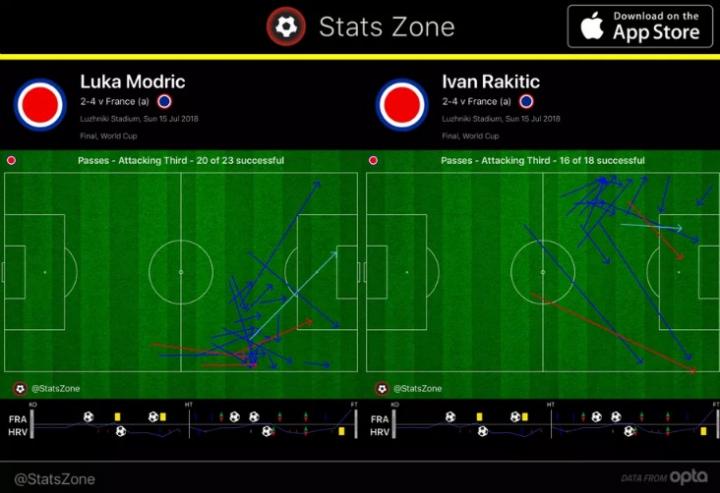 布罗佐维奇的传球次数超过了法国队几名中场球员的总传球次数,包括博格巴、坎特、恩宗齐和马图伊迪。作为全世界最出色的防守型中场,坎特也未能在与克罗地亚中场的对抗中占据上风,上半场就被出示一张黄牌,下半场开始不久后被换下。90分钟的比赛里,法国队在克罗地亚球门前最后三分之一区域完成了共27次传球,莫德里奇和拉基蒂奇俩人在法国球门前最后三分之一区域的传球就超过了这项数据。