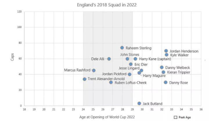 作为对比,在法国和比利时两队的首发阵容中,绝大多数关键球员正值巅峰期,或甚至还没有到巅峰期的年龄。另一支四强球队英格兰的情况相仿,到四年后的2022年世界杯前,这支球队中的绝大部分球员年龄都在28岁左右。