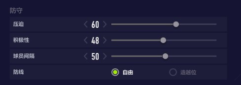 防守间隔调得高,则后防线站位更宽阔,球员之间防守的距离更大,后防线防守覆盖范围也更大。但相对地,更容易出现空位,高的防守间隔,能有效克制对手的下底传中踢法,如果玩家布置5个后卫的话,防守间隔可以调得高一点。
