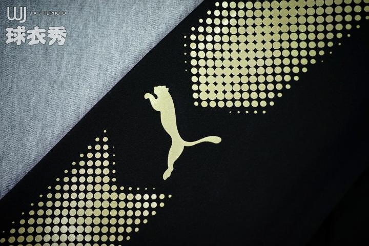 ↑球衣引用了彪马最新的模板,肩部时髦的金色圆形点阵组成箭头的图案,并向下延伸到袖口,创造出华丽的变幻效果。