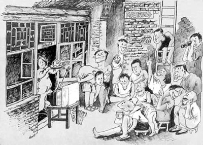 居委会有一台罗马尼亚产的21吋黑白电视机,平日都像宝贝一样被锁在柜子里,只有赶上五一、十一这样的节日或者党中央发布重大新闻的时候,这个宝贝才被请出来搬到大院里供群众们观看。
