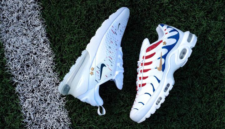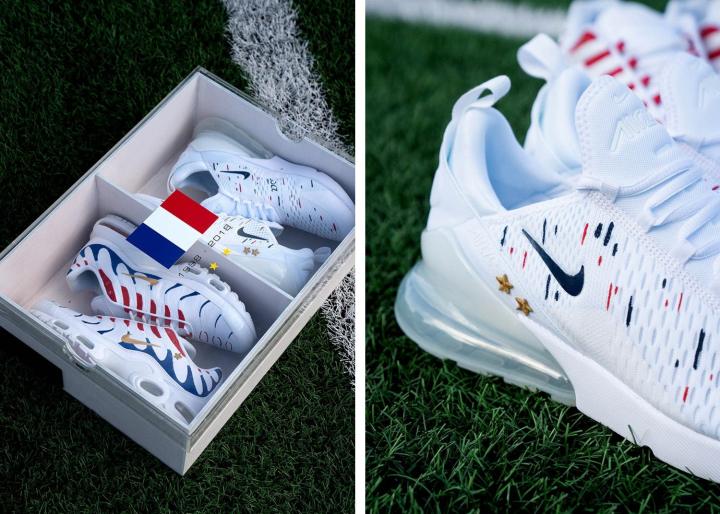 两款球鞋的设计灵感均以法国国旗为灵感打造,白色鞋面上加入蓝白红三色装饰,其中Air Max 270的鞋面设计与今年法国国家队客场球衣十分相似。此外,两款球鞋上分别加入象征世界冠军的金星,其中Air Max Plus为一颗,Air Max 270为两颗。