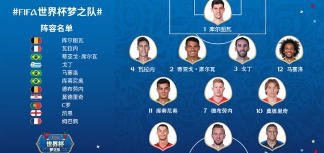 我们先来看一下这11人都是谁:守门员是库尔图瓦,后场球员是马塞洛、戈丁、蒂亚戈席尔瓦与瓦拉内,中场球员是库蒂尼奥、德布劳内与莫德里奇,而前锋球员是:C罗、哈里凯恩、姆巴佩。