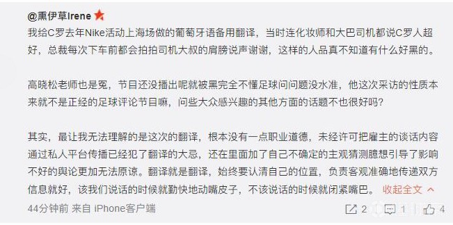 他在帖子里写道,“请大家不要diss高晓松和C罗这两个人!这根本就是团队策划的问题,C罗这次来中国就是Nike行!这个采访是临时加进来的。”