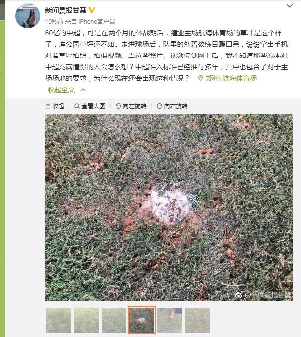 记者在微博中写道:80亿的中超,可是在两个月的休战期后,建业主场航海体育场的草坪是这个样子,连公园草坪还不如。走进球场后,队里的外籍教练目瞪口呆,纷纷拿出手机对着草坪拍照,拍摄视频。当这些照片、视频传到网上后,我不知道那些原本对中超充满憧憬的人会怎么想?中超准入标准已经推行多年,其中也包含了对于主场场地的要求,为什么现在还会出现这种情况?