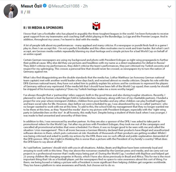 谁能想到,在这个时候,厄齐尔退出国家队的声明公布了出来——只要我还能感到这样的种族歧视和不尊重,我就不会再为德国国家队效力。曾经,身披德国球衣让我感到兴奋和自豪,但现在不是了。这是一个非常艰难的决定,因为我总是为了我的队友、教练组成员和德国的好人们付出一切。但是,当那些德国足协的高官们以这样的方式对待我,当他们亵渎我的土耳其血统,并且自私地将我作为宣传政治的工具,我已经受够了。这不是我踢足球的原因,我也不会对这样的行为坐视不管。种族歧视永远,永远都不能被接受。