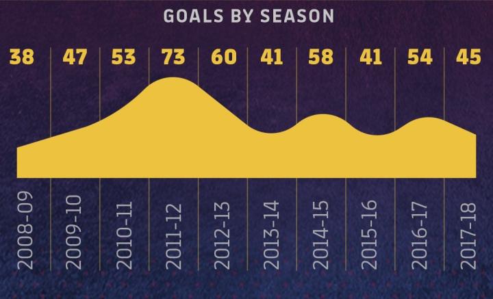 这10个赛季里梅西为巴萨的进球数分别为:38、47、53、73、60、41、58、41、54和45,进球数最少的一个赛季也达到了38个。