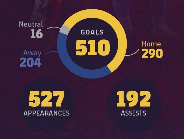这10年来,梅西一共为巴萨踢了527场比赛,打进510球,助攻192次,和球队一起获得过27个冠军(包括3个欧冠冠军、7个西甲冠军、6个国王杯冠军、5个西班牙超级杯冠军、3个欧洲超级杯冠军以及3个世俱杯冠军),拿到过5座金球奖。