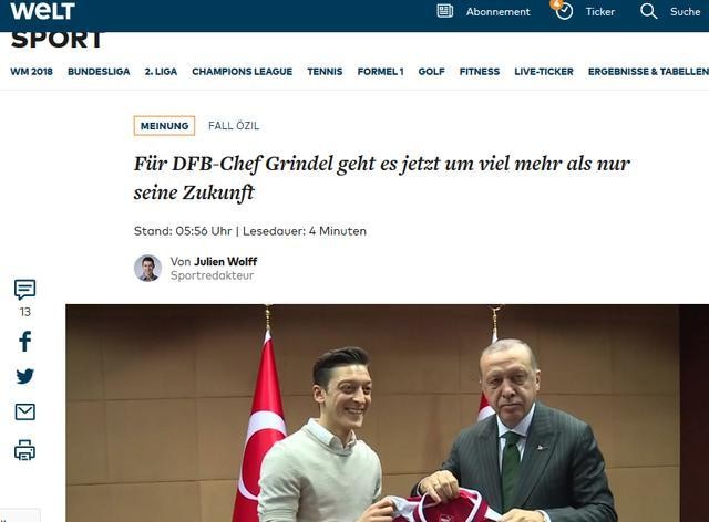 在这三篇长文中,厄齐尔终于首次公开回应了与土耳其总统埃尔多安的合影事件,并怒批德国媒体和赞助商的双标和对自己的不公,并在言辞激烈地抨击德国足协主席格林德尔后最终作出了退出德国国家队的决定。