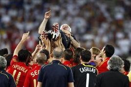 赛后,西班牙众球员把一位老人高高抛起,那位带领西班牙摘掉“预选赛之王”帽子的老人,阿拉贡内斯。