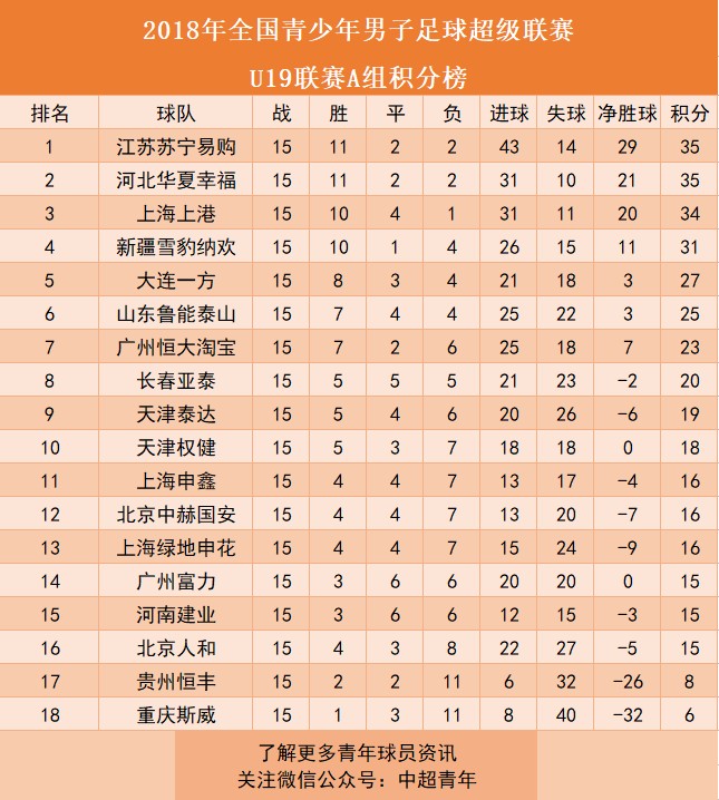 五、青超联赛U19联赛A组第15轮:苏宁险胜申花,一方击败鲁能。