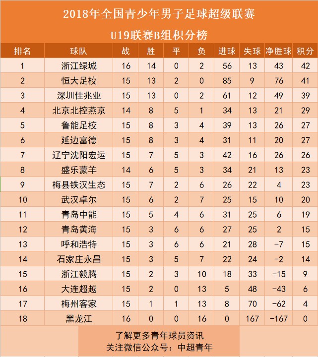 六、青超联赛U19联赛B组第15轮:浙江绿城继续领跑。