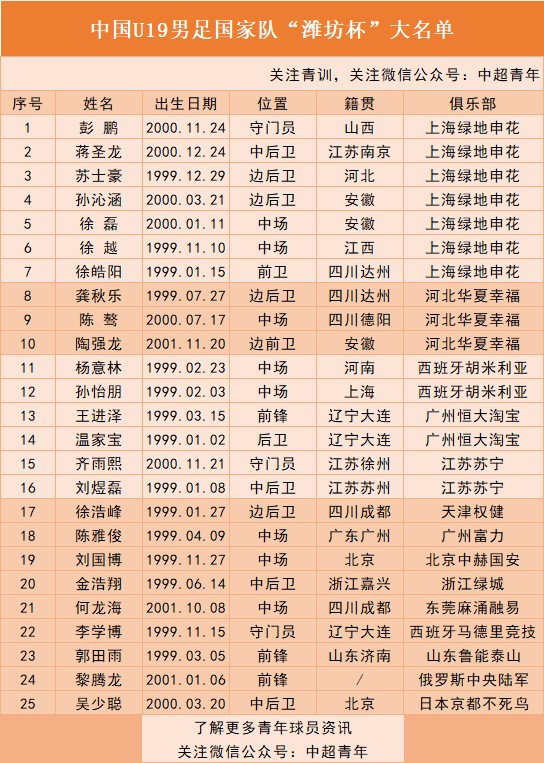 二、“潍坊杯”U19国青队名单:黎腾龙入选,陶强龙徐皓阳补充。