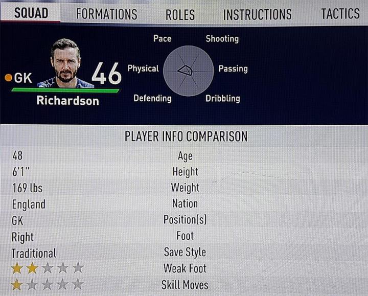 那段时间里,他在46岁时踢了自己职业生涯的最后90分钟比赛,而他在《FIFA 18》里的评分也恰恰是46分。目前理查德森在赫尔城担任守门员教练,但由于赛季开始时他尚未正式退役,所以他的名字仍然出现在了EA Sports的球员名单中。