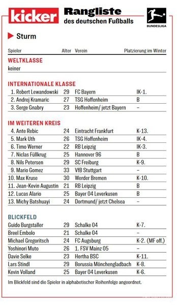 权威媒体《踢球者》公布了本期德甲球员评级的前锋榜单,世界级一栏继续空缺,莱万多夫斯基、克拉马里奇和格纳布里被评选为洲际级,排名前三位。在上赛季以及今夏的俄罗斯世界杯上表现出色的法兰克福球员雷比奇,排在了榜单的第四位,领跑国脚级栏目。