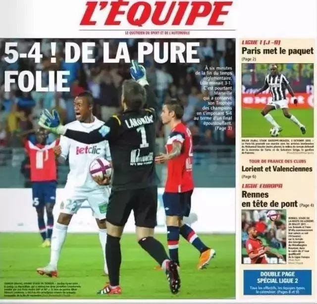 可这场还不是法国超级杯历史上进球最多的一场比赛,2011年的法国超级杯更刺激!那场比赛赛后《队报》的头版大标题为“DE LA PURE FOLIE”,纯粹的疯狂!