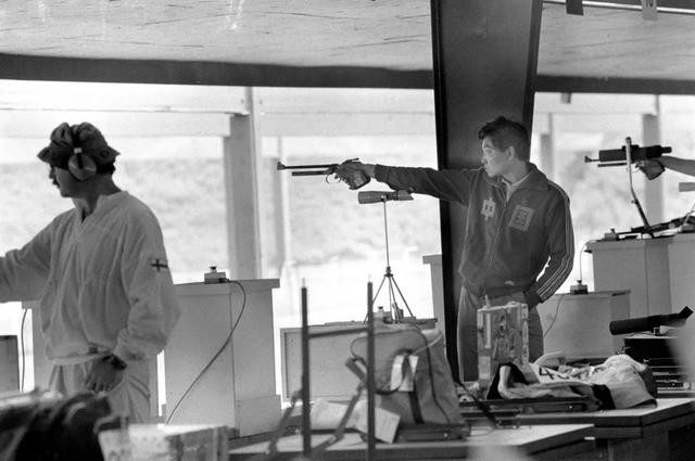⑮1984年7月29日,中国运动员许海峰(右)在洛杉矶奥运会男子自选手枪射击比赛中,夺得本届奥运会的第一枚金牌。新华社记者 官天一 摄