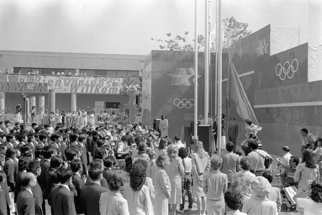 ⑱1984年7月17日,中国体育代表团在美国洛杉矶奥运村举行升旗仪式。新华社记者 孙连生 摄