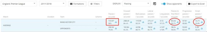 上赛季,蓝月亮的将士们用场均723次传球(90%成功率)实现了对瓜一年577次传球(86.7)的大幅度提升,也让英超绝大部分对手疲于奔命,他们在对阵曼城的比赛平均仅能完成260次传球(76%)。可以说,在通过更多地将球掌控在脚下进而限制对手威胁进攻次数的角度上,瓜帅和他的球队已经做到了极致。