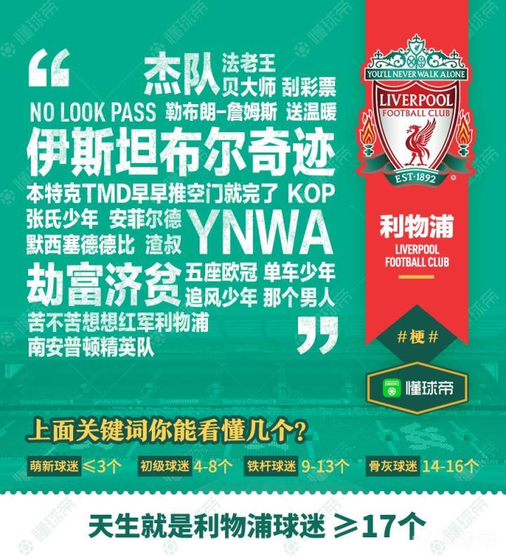 懂球帝海报:利物浦球迷死忠测试,你都知道哪些关键词和梗..懂球帝海报君 @懂球帝2018-08-11 18:41懂球帝海报:利物浦球迷死忠测试,你都知道哪些关键词和梗?作为红军球迷的你,你对你的主队了解吗?下面这张海报涵盖了利物浦的一些关键词和梗,你都知道几个呢?快来测试一下吧!展开更多