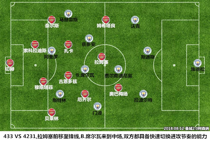 此役,双方都在失“核”的情况下进行比赛,埃梅里将新援托雷拉放在了替补席上,在国际冠军杯中表现出色的古恩多兹得到了与扎卡、拉姆塞搭档的机会;瓜迪奥拉选择让德布劳内和大卫-席尔瓦继续休息,在社区盾杯中表现一般的萨内也被留作后手。斯特林回归主力与马赫雷斯搭档两翼,上赛季更多作为锋线球员首发的伯纳多-席尔瓦连续两场比赛出现在中场,瓜迪奥拉希望利用他的盘带化解费尔南迪尼奥和京多安的压力,并配合内切的门迪限制扎卡与古恩多兹的出球。