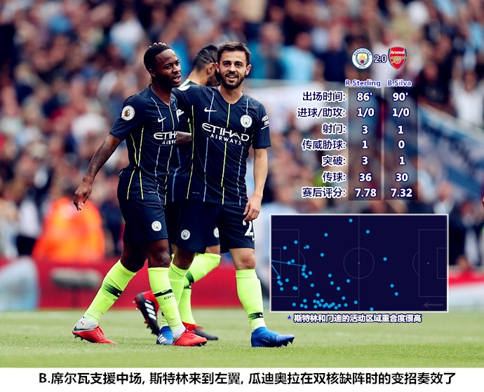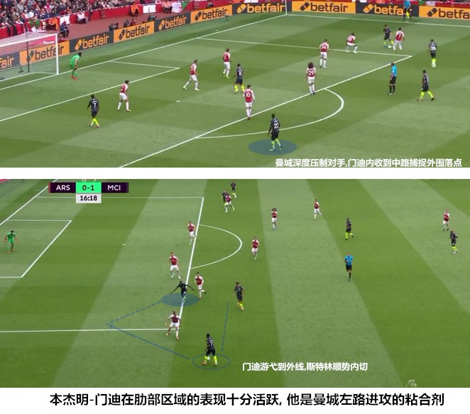 门迪出色的有球技术和多功能属性,对身前的斯特林也起到了很好的支撑作用。在与萨内搭档两翼的时候(上赛季),斯特林更多的作为无球接应者承担了门前一击的重任,多次错失单刀机会令其倍感压力;马赫雷斯占据右路首发位置后,瓜迪奥拉将萨内调至左翼(社区盾),但这位上赛季英超最佳新人似乎尚未从落选德国世界杯大名单的打击中解脱出来,德国人在社区盾杯中完成了糟糕的半场表演,这让他在此役沦为替补。此役,斯特林抓住机会证明了自己的有球技术并未退步,其与门迪之间的心有灵犀足以摧毁列强的右路防区,英格兰人已经在与萨内的首发竞争中占据了先后。