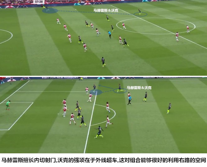 由于两名边后卫职责差异很大,曼城的两翼进攻呈现出了不同的风貌。左路的斯特林和沃克承担着推进和组织任务,他们在落于阵地之后会招呼更多的队友进行深度配合;右路的马赫雷斯更多地作为无求接应者承担终结任务,如果不能在第一时间完成内切射门,阿尔及利亚人也不会急于提速下底,而是适当降速控制节奏,等待后排的沃克插上接应分球后完成下底传中。