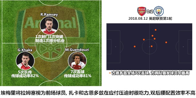 从比赛的实际进程上来看,埃梅里显然是高估了扎卡&古恩多兹组合的承压能力。前者一如既往地畏惧逼抢、出球拖沓,后者在强度更高的比赛中暴露了经验不足的缺陷,埃梅里前置拉姆塞用以加强进攻的策略因后腰失势沦为无源之水,曼城在中路的重兵集团切断了枪手中后场与前场之间的联系,释放出的边路空间成为了球队的进攻通道,斯特林&门迪组合摧毁了枪手的右路防区。
