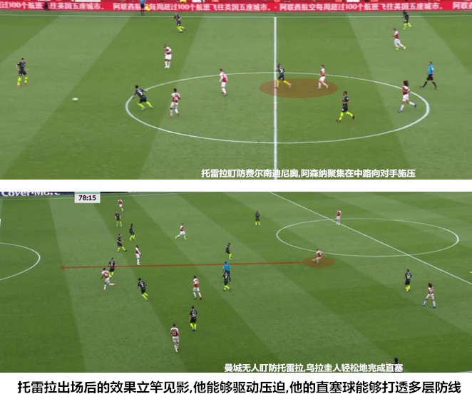 面对比分落后的局面,埃梅里迅速作出了调整,枪手开始主动出击实施高位逼抢,制造更多的在前场断球后就地打反击的机会。姆希塔良和厄齐尔被固定在边路影响了球队的进攻组织,球队在反击中缺少速度型球员完成持球推进,枪手必须依靠高位逼抢将战火烧向曼城半场才能发挥两名组织者的特点。在拉卡泽特和托雷拉相继出场后,阿森纳中路压迫的强度和制造纵深的能力得到了显著提升,阿圭罗和伯纳多-席尔瓦在体力下降后无力约束托雷拉,乌拉圭人多次轻松地在中路策动攻势。瓜迪奥拉在最后时刻连续换上热苏斯和萨内,就是为了提升前场的活力,减轻中后场球员的防守压力。
