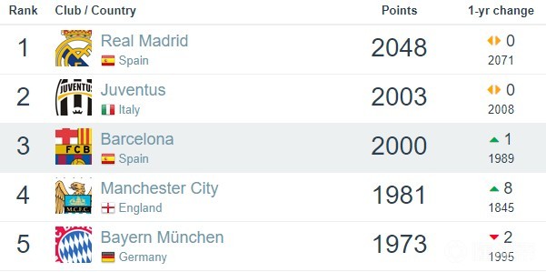 【世界俱乐部排名:曼城超拜仁居第4;鲁能国安进入亚洲前30】