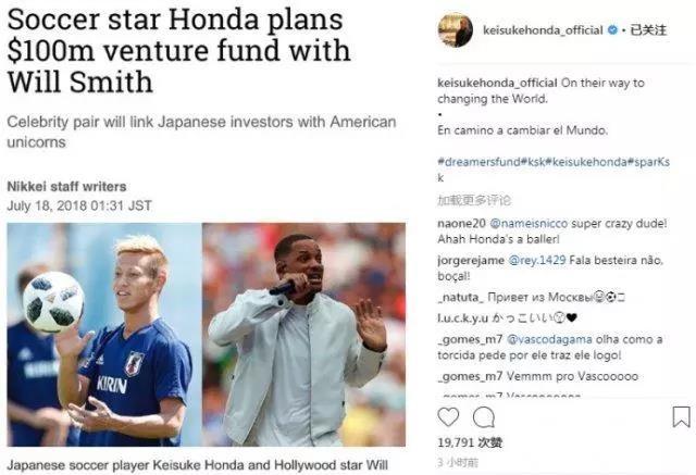 他在2016年成为了联合国儿童基金会的全球推广大使,随后又成为美国麻省理工大学媒体实验室特别研究员,致力于改善教育。不久前又和美国演员威尔·史密斯共同成立风投基金,将在日本筹资约1亿美元,向以美国为主的优秀新创公司投资。该基金将充分利用两人的人脉,寻找那些此前很难在日本接触到的潜力企业。本田圭佑对于此举,在自己的社交媒体上说道:正在改变世界的路上。梦想的力量一直推动着本田圭佑写下一个个人生惊叹号。