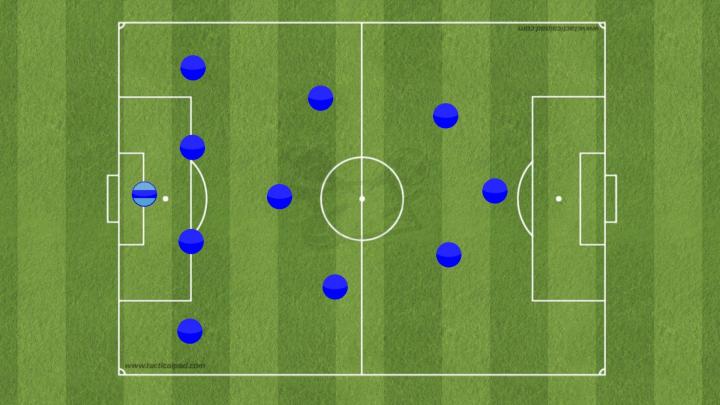通过这种设置,那不勒斯在一侧会形成2(己方半场)+3(对方半场)的人数优势,这样他们可以耐心从容控球,并吸引对方的防守,然后寻找向前给进攻队员的传球机会,他们主要战术目的就是,最终能够在进攻三区占据这种可以垂直传球的通道。