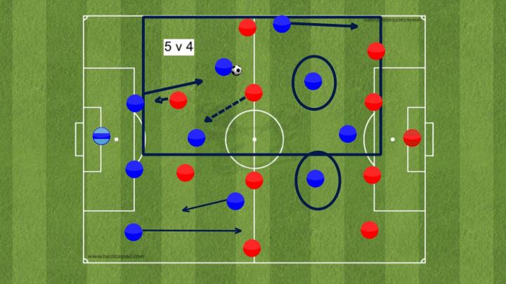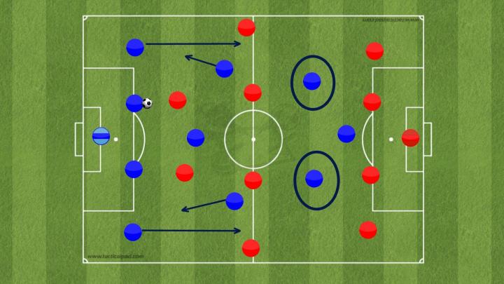 在第二阶段(中场)和第三阶段(前场)两名内锋就非常关键,他们会在两条线间的肋部操作,这样他们很难被盯防,如果对手后卫紧跟他们,他们的身后就会留下空间,而这就很容易被前锋所利用。