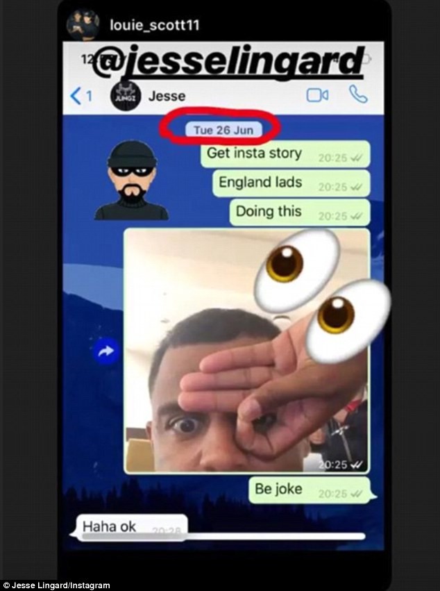林加德在自己的社交媒体上发了之前6月26日的一张截图,那是他和朋友在WhatsApp聊天软件上的对话,他的朋友让英格兰的球员们率先做这个动作,林加德表示“OK”。
