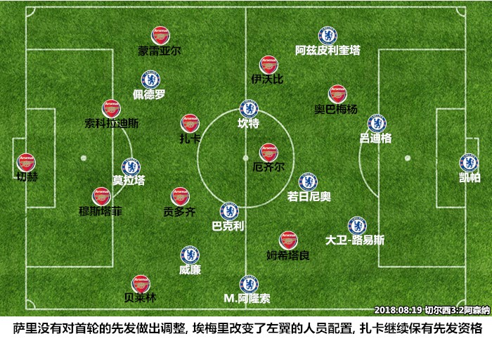 此役,萨里沿用了首轮对阵哈德斯菲尔德时的首发阵容,威廉、莫拉塔和佩德罗搭档锋线,阿扎尔依然被留作第12人,在英超关窗前火线加盟的科瓦契奇坐上了替补席;埃梅里对首轮不敌曼城的首发阵容做出了两处调整,蒙雷亚尔和伊沃比取代了奈尔斯与拉姆塞,令人稍感意外的是,风评不佳的后腰组合贡多齐和扎卡得到了连续首发的机会,埃梅里对两名球员在进攻组织和推进阶段的能力是很有信心的。