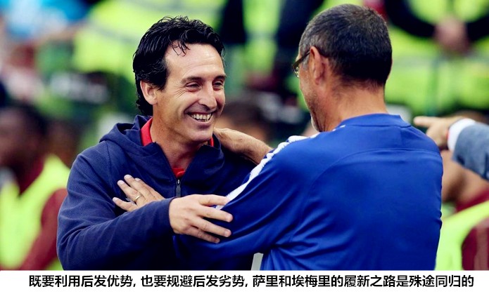 两位新帅共同的目标就是为用先进的理念包装新东家,萨里的计划是将那不勒斯433体系的打法和配置移植到斯坦福桥,埃梅里为球员们灌输的理念是"强度、进攻、进球、战斗、拼搏"。他们的战术体系都由高位压迫、流畅传切和快速进攻组成,萨里更加重视短传渗透,他对传球速率和节奏要求更高,蓝军在驱动高位压迫时的表现更加激进;埃梅里的球队具备不俗的向前意识,在边路制造纵深的能力更强。