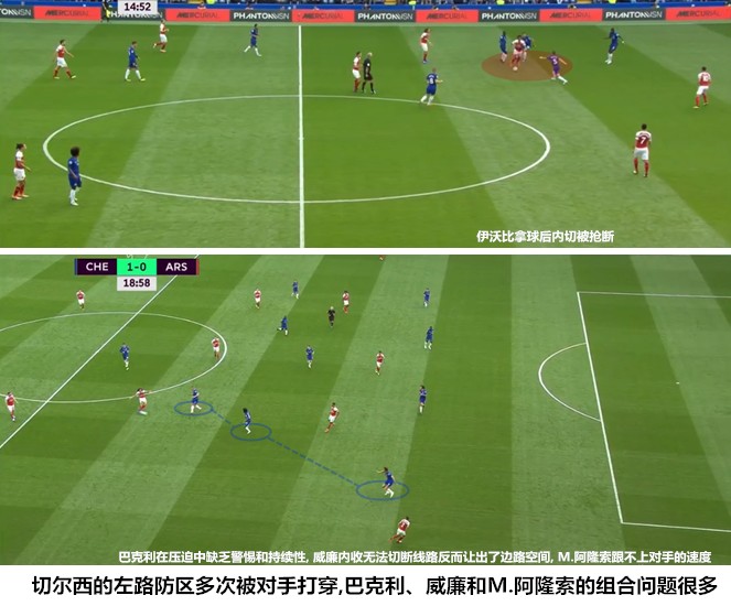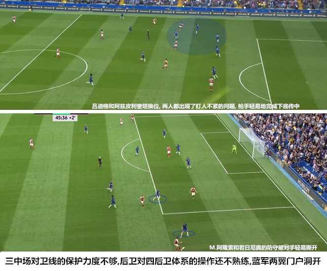 由于脚下频率和转身速度较慢的弱点,马科斯-阿隆索很难限制对手的边路快马。孔蒂的三中卫体系有边中卫和中前卫负责保护边翼卫,四后卫体系没有这种战术红利。萨里希望三名中场可以在轮转中扮演“第五后卫”的角色,若日尼奥在中前场逼抢时有过多次拦截,但他在低位防守中却缺少硬度和警觉性,意大利国脚很难跟上对手前插进攻球员的步伐,也鲜有依靠预判切断对手传球线路的经历。巴克利的脚下缠斗能力有所不足,对持球人的施压缺乏延续性;坎特在前插后很难及时返航,在后场落位后的职责也不够明晰,他还在适应B2B中场的新角色,激增的球权和进攻任务让法国人有些无所适从。