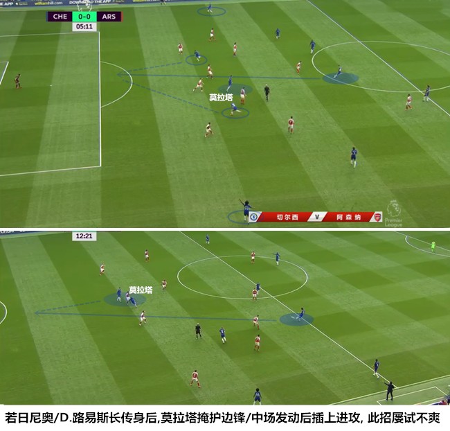 除了接应阿兹皮利奎塔的过顶输送打破进球荒以外,莫拉塔最重要的作用就是作为前场支点推动了整个进攻扇面的展开。边路球员尽力拉开宽度,若日尼奥和大卫-路易斯轮流发牌,莫拉塔的工作就是在中路背身接球吸引防守,扯开肋部的空当供后排队友使用。由于莫拉塔现阶段的对抗能力还无法满足阵地攻坚的要求,巴克利和坎特的技术能力很难支撑复杂的肋部进攻,切尔西只能依靠威廉和马科斯-阿隆索的配合在外线完成渗透,在中路只能依靠过顶球打身后的方式完成进攻。