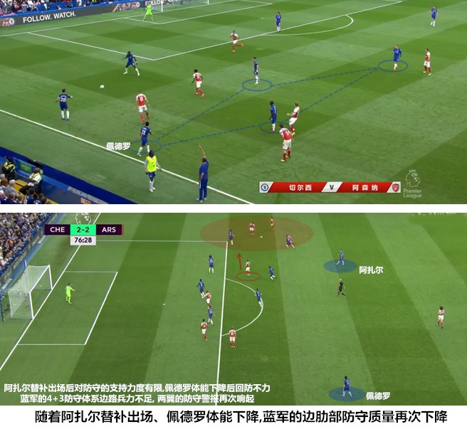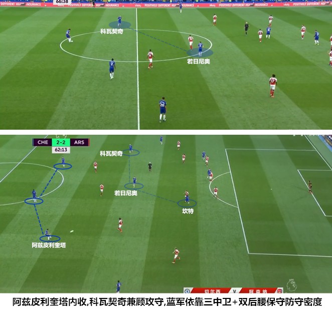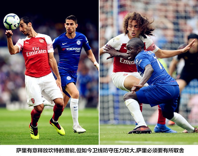 在温格和孔蒂对弈的时期,切尔西和阿森纳是列强中不太注重高位紧逼的两家,包括阿扎尔和厄齐尔在内的很多球员都无法做到持续向对手施压,执意驱动高压反抢很可能因为单点的陷落而造成体系坍塌。两支球队先后使用三中卫阵型,一方面是为了提升后场的防守密度,解放前场攻击手,另一方面也是难以驱动压迫战术时的无奈之举。