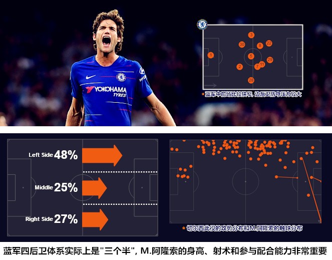 尽管已经连续两个赛季无缘前四,但阿森纳围绕有球核心进行快速传切的能力依然处于英超顶尖水准。他们本场的主攻方向是主队的左闸,方式是依靠阵型的左倾破坏蓝军的防守重心,通过直塞球穿越肋部去攻击大卫-路易斯与马科斯-阿隆索的结合部。切尔西防线的左侧扇面由马科斯-阿隆索、若日尼奥、威廉和巴克利组成,这四名球员中有一位新援、一位刚刚晋升为主力的球员以及两名在本赛季改变了位置的球员,四人的单兵防守都存在一定的问题,拼接之后又不能起到1+1>2的结果,遭遇围攻后露出破绽是在所难免的。