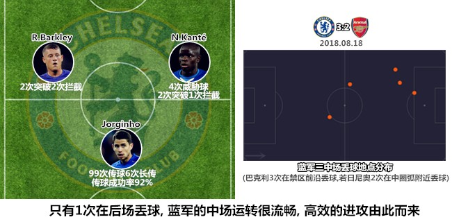 两支球队均敢于在阵地战中投入重兵,切尔西方面对于进攻线路的规划更加复杂,球员们的战术执行力也比较到位。蓝军依靠边后卫/边锋打开宽度之后,避免横线上的重叠站位,尽可能地保证纵向空间上的层次,争取在对手中场和卫线之间的缝隙内完成进攻衔接。在经历了社区盾和联赛首轮的磨合后,蓝军此役的传切流畅度已经较为可观,枪手"不高不低"的防线站位给予了蓝军球员很多自由发挥的空间。