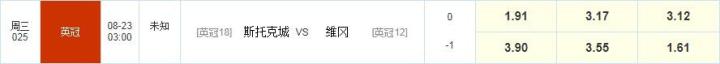 亚盘推荐:斯托克城-0/-0.5