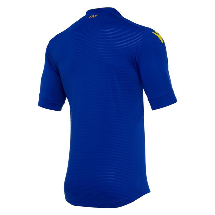 客场球衣则以蓝色为基调,球衣前后加入微妙的水平暗纹。球衣拥有一个别致的蓝色立领,领口加入源自国旗的黄红两色。与主场球衣相同,客场球衣背后衣领下方同样加入金色刺绣的安道尔足总名称缩写“FAF”。