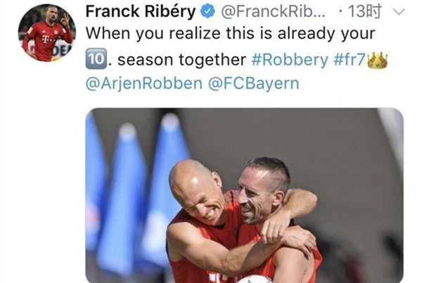 “当你意识到这已是和罗本在一起的第十个赛季。” 赛季前,里贝里在社交网络上传了一张和罗本的合影,并留下了这句令无数球迷泪目的文字。