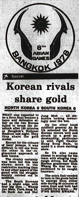 (1978年亚运会足球决赛之后的报纸,上面写着《朝鲜半岛共享金牌》)