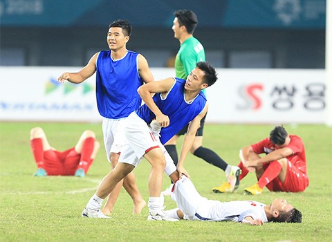 当终场哨声响起,越南国奥队的球员瘫倒在地上,疲惫与喜悦交织在一起。阮光海早已抽筋,在比赛结束前,他又与叙利亚球员发生碰撞,眼角的血还未止住;而范德辉也已无法坚持,他甚至不能走到场边迎接观众的欢呼,只能在阮英德和阮文全的搀扶下走出球场;杜维孟也是一样,受伤无法行走的他在第117分钟被换下场,他遭遇的是大腿拉伤。